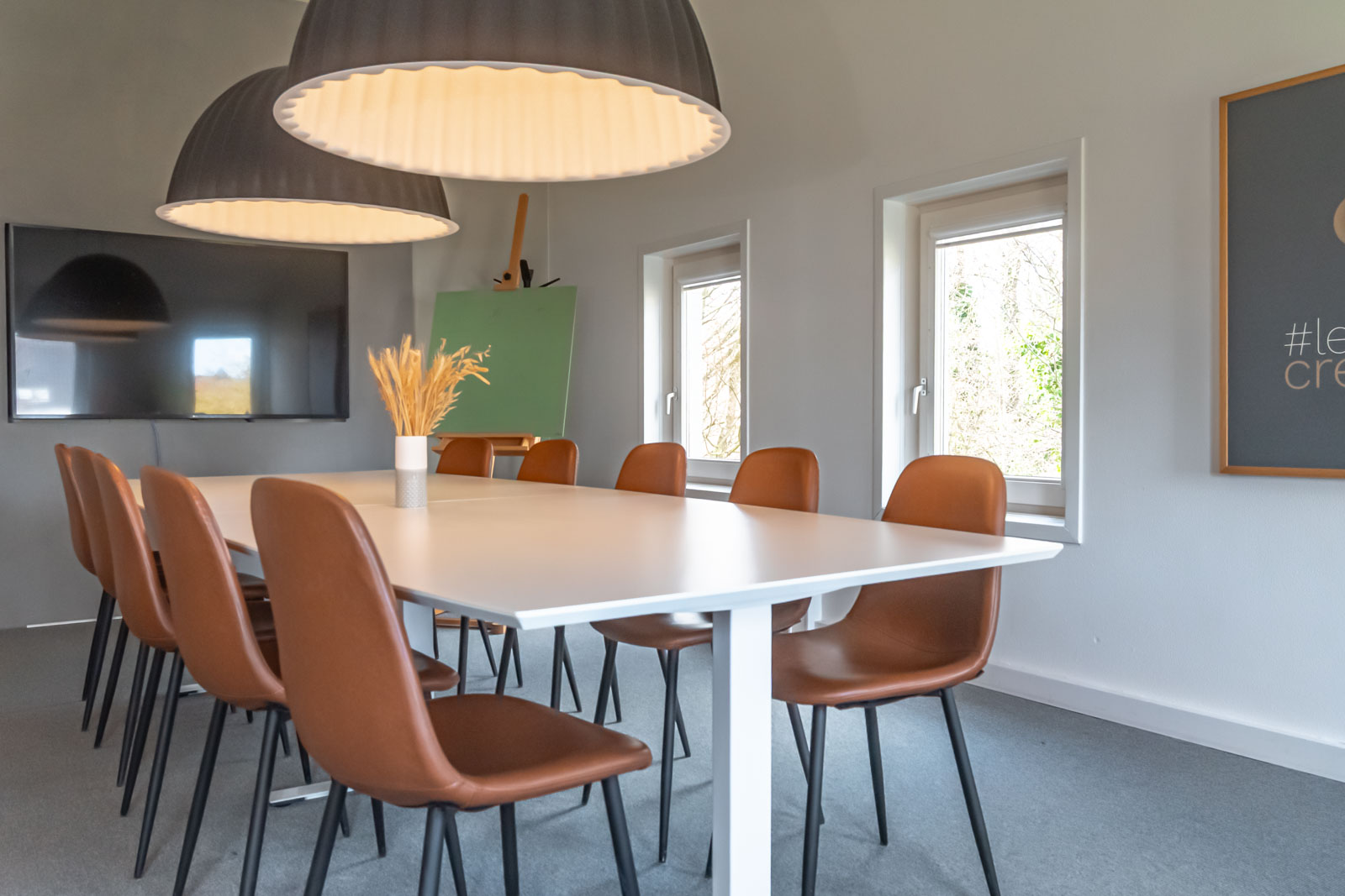 Her er moderne AV-udstyr og en hyggelig og uformel atmosfære med udsigt til haven.